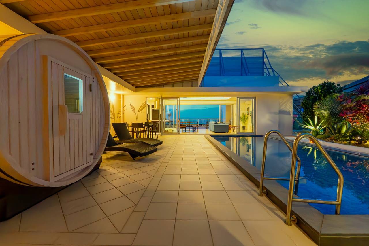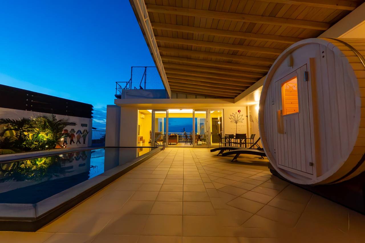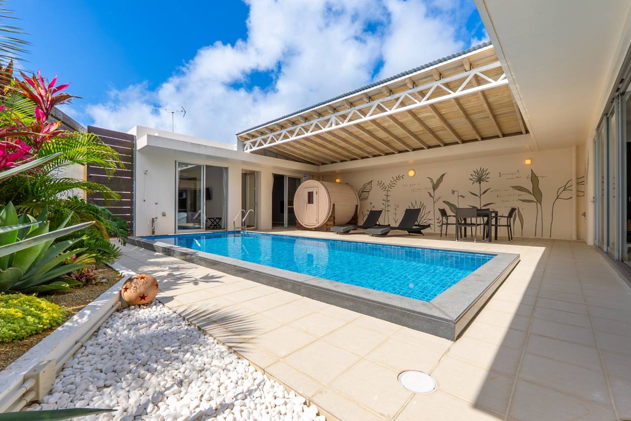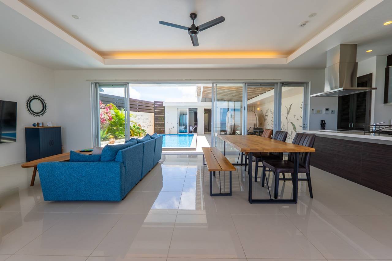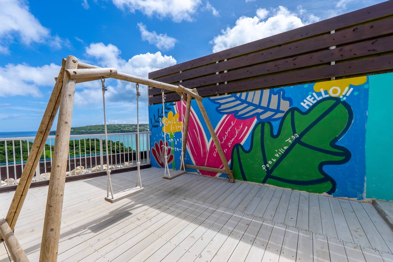 沖縄でプライベートな時間を楽しみたい方やプール付きの貸別荘をお探しの方に、運天の高台に建設されたヴィラでの宿泊を提供しています。朝の爽やかな時間帯にも夜のロマンチックな時間帯にもプールを楽しめ、広がる海と古字利島を一望できるテラスでは、日常の喧騒から離れてリラックスできお子様から大人まで楽しめる木製ブランコもご用意しており、夜は都会では見ることがない満天の星を、今帰仁村にてご堪能頂けます。